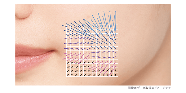 肌表面の動きを撮影し、肌の奥(表皮・真皮・皮下組織)の状態を推測。肌の動きの速さ、方向などの特徴を抽出して、14秒の映像から約170万個の情報を引き出すことができます。